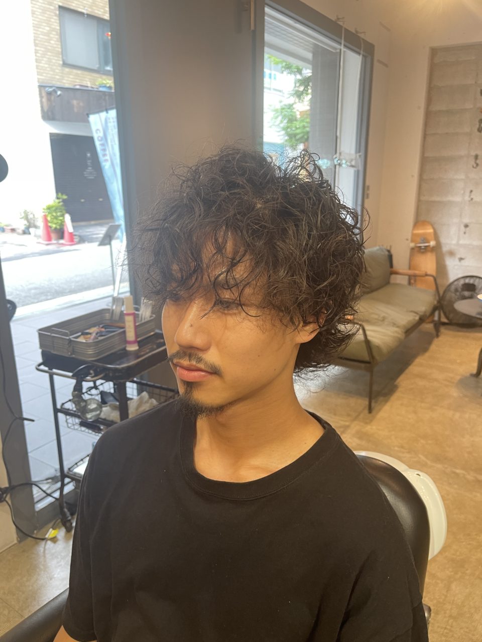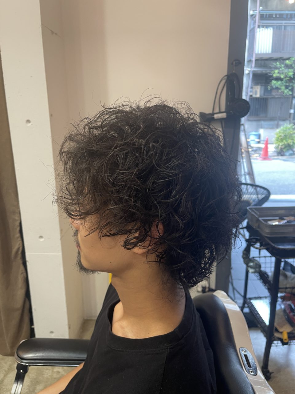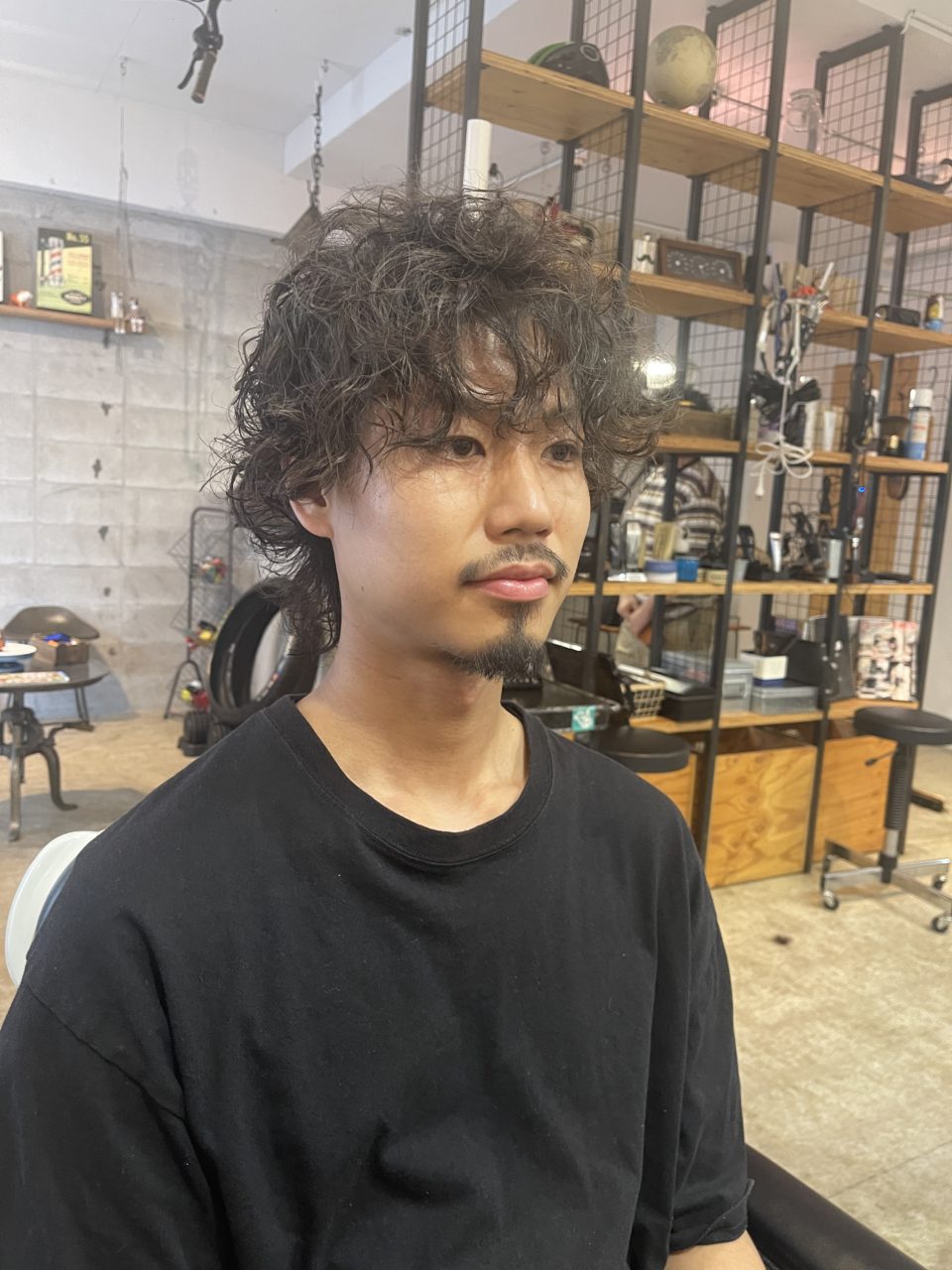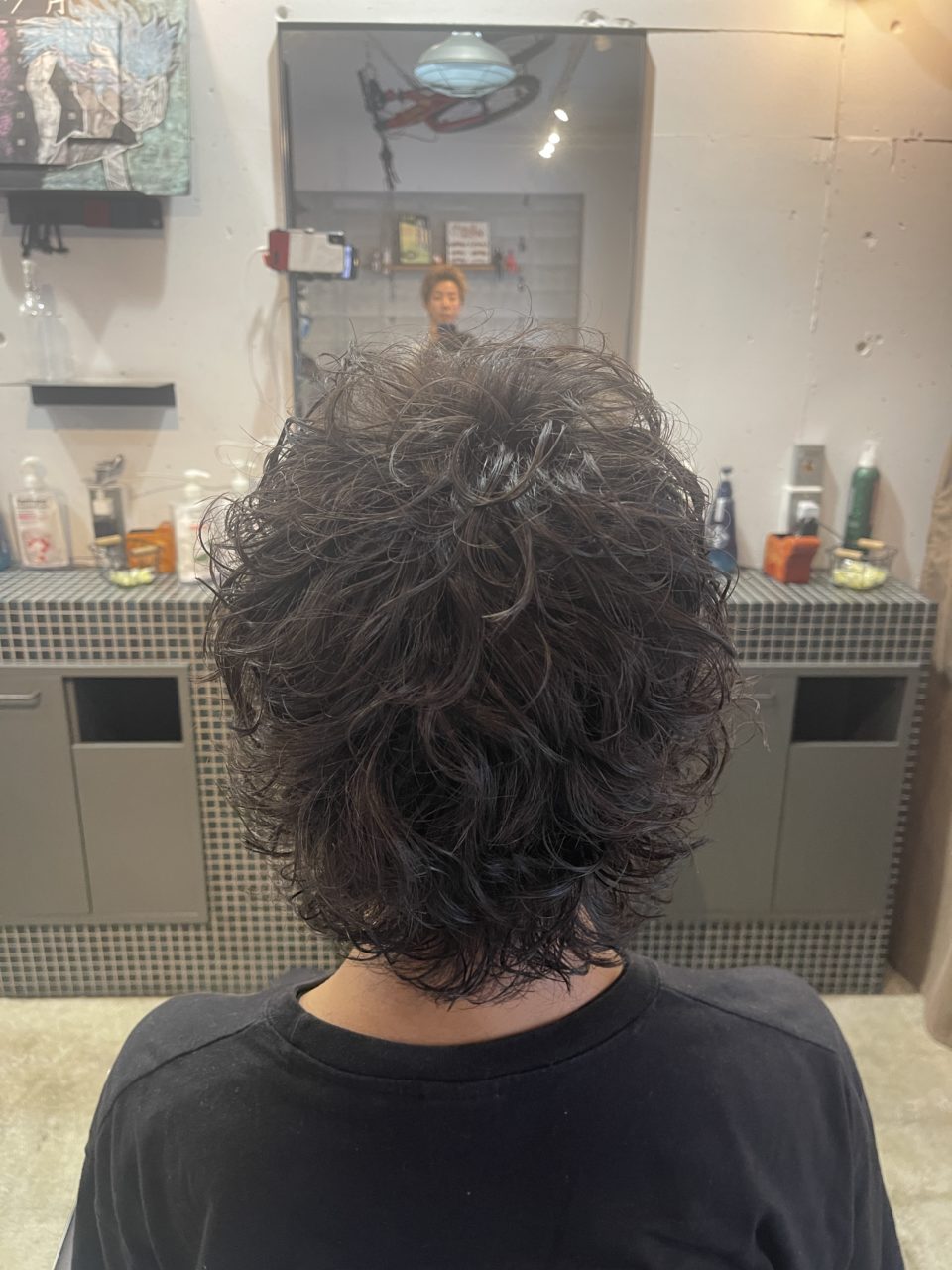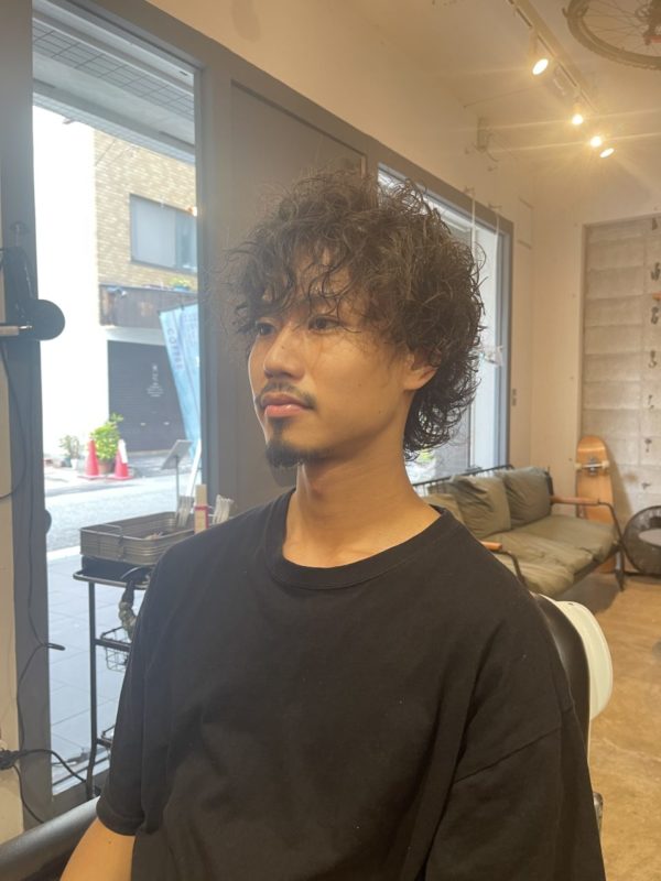 見せて頂いたイメージ画像はサイドが耳にかかるくらいの長さで 強めのパーマをあてていたので リッジのでやすいスパイラルで巻かせて頂きました。